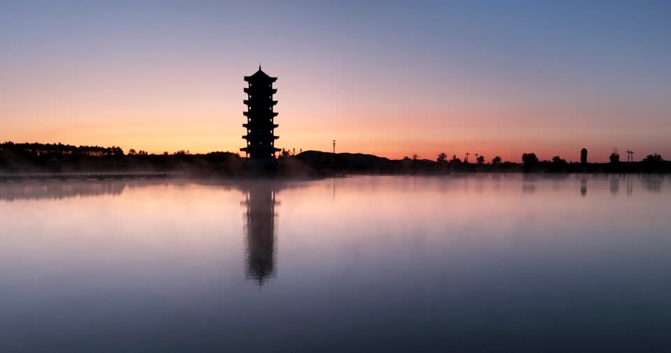 - 倒影,宝塔,建筑,水域,地平线,水资源,天空,其他场景,地标建筑,自然景观,旅游,地理,塔,水路,日落,霞,日出,日出日落,黄昏QM159892647