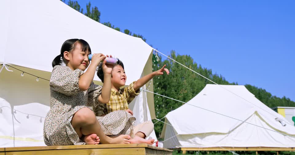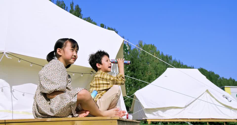 - 男孩,女孩,儿童,两个人,伙伴,兄弟姐妹,二胎,陪伴,看,做游戏,玩耍,挥手,指,万花筒,望远镜,休闲装,连衣裙,坐,微笑,露营地,露营,帐篷,天幕,草地,聚会,假日,旅游,户外,晴天,看向远方QM160081911