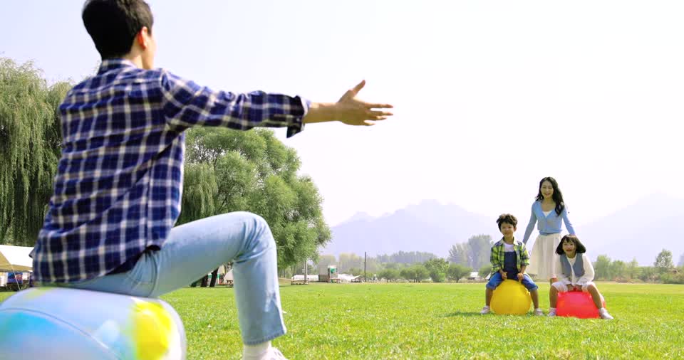 - 男孩,女孩,儿童,爸爸,妈妈,多人,一家四口,家庭,亲子,陪伴,兄弟姐妹,二胎,张开双臂,做游戏,玩耍,运动,跳跳球,球,跳跃,跳,羊角球,休闲装,微笑,草地,周末活动,公园,户外,晴天,面对面,东方人QM160081580