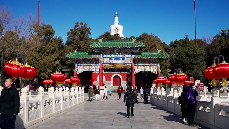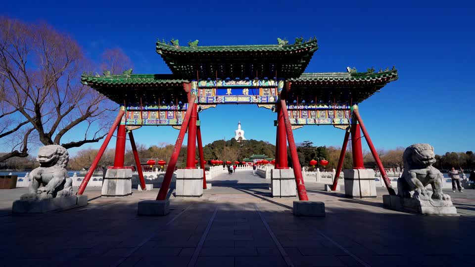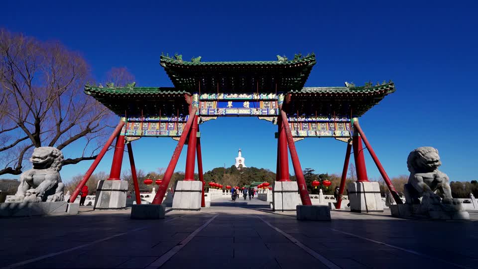 - 北京,北海公园,北海,白塔,湖泊,湖面,树林,冰面,蓝天,白云,公园,古代建筑,标志性建筑,自然风光,城市建筑,建筑,自然,无人,户外,白天,牌楼,石狮子,积翠,牌匾,永安桥,延时QM160097944