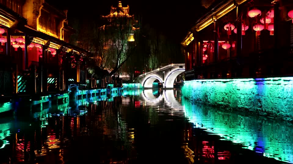- 夜晚,水路,运河,自然景观,地标建筑,交通场所,其他场景,旅游,地理,大都市,江南古镇_水乡,拱桥,地标,都市区,航道,拱形,红色QM160134058